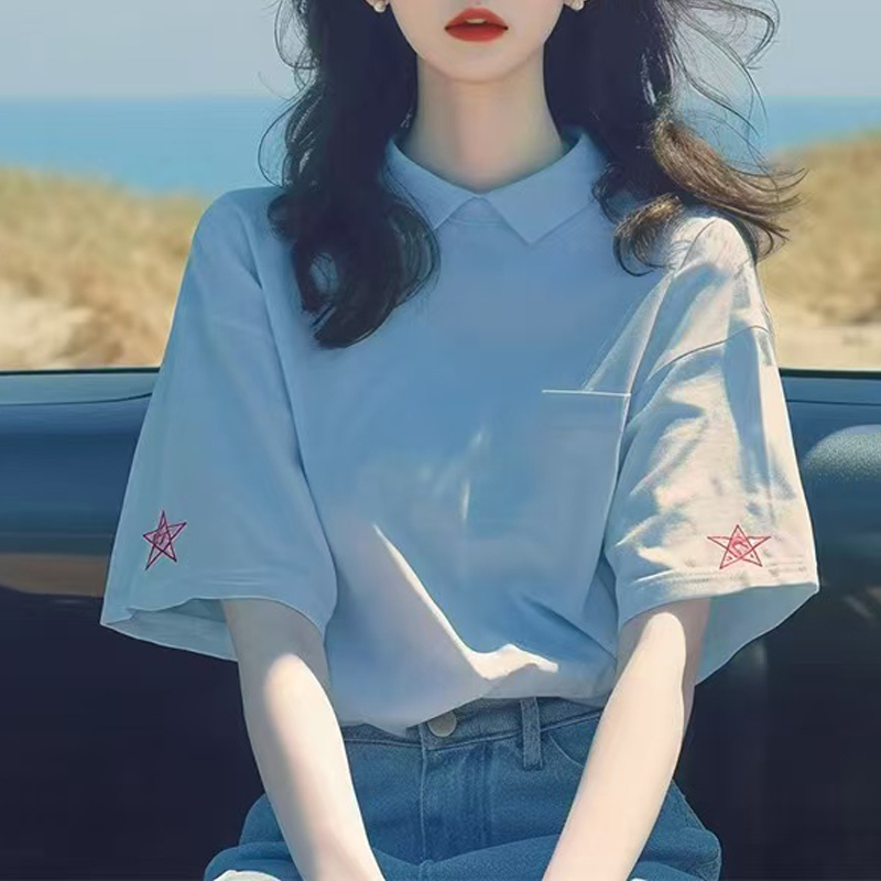Blue embroidered loose pullover short-sleeved women's summer shirt