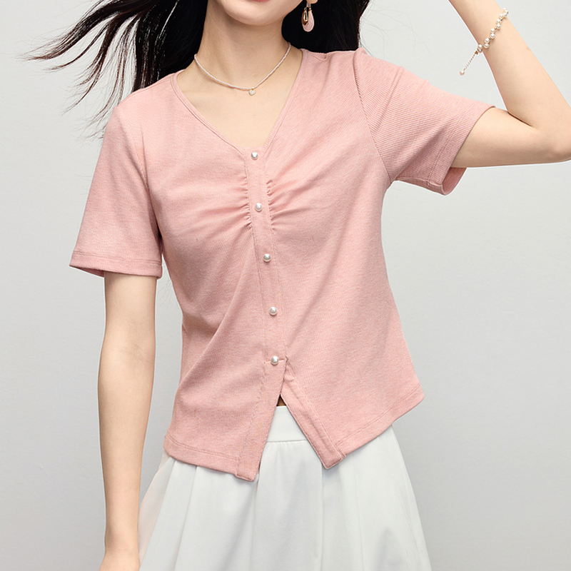 Design pink pleated short women's V-neck t-shirt top