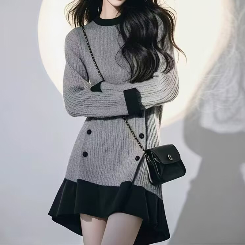 Gray contrast color stitching knitted dress autumn and winter women's knitted dress
