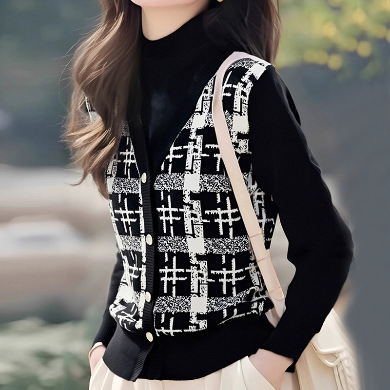 Contrasting stripe black fake two-piece autumn and winter women's sweater