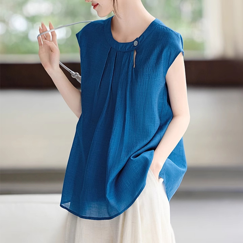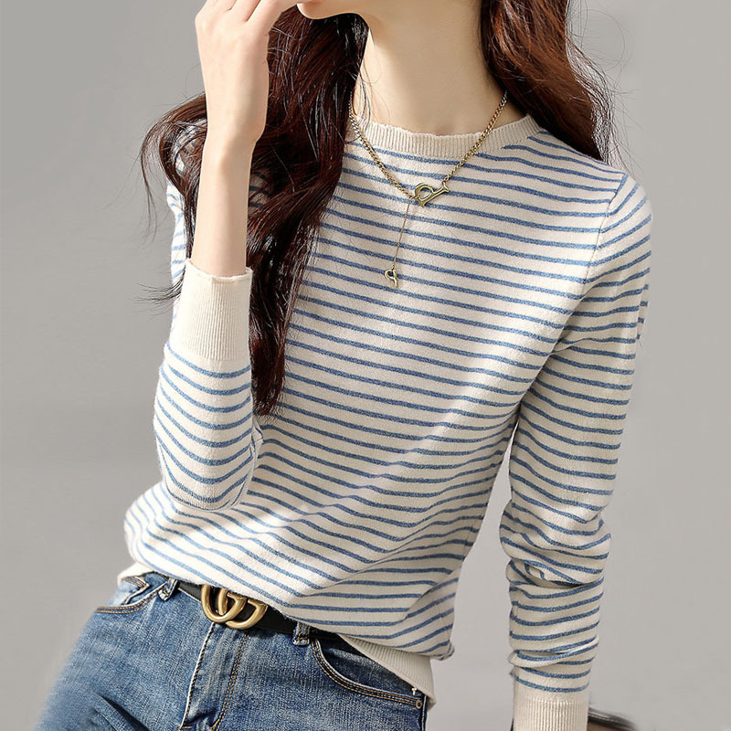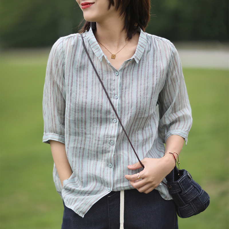 Wen Qing Fan vertical stripe blue quarter sleeve blouse