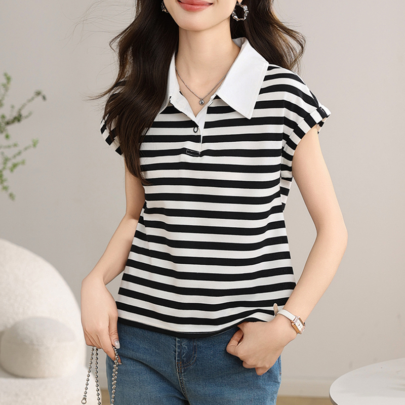 Contrasting lapel black and white stripe short-sleeved t-shirt