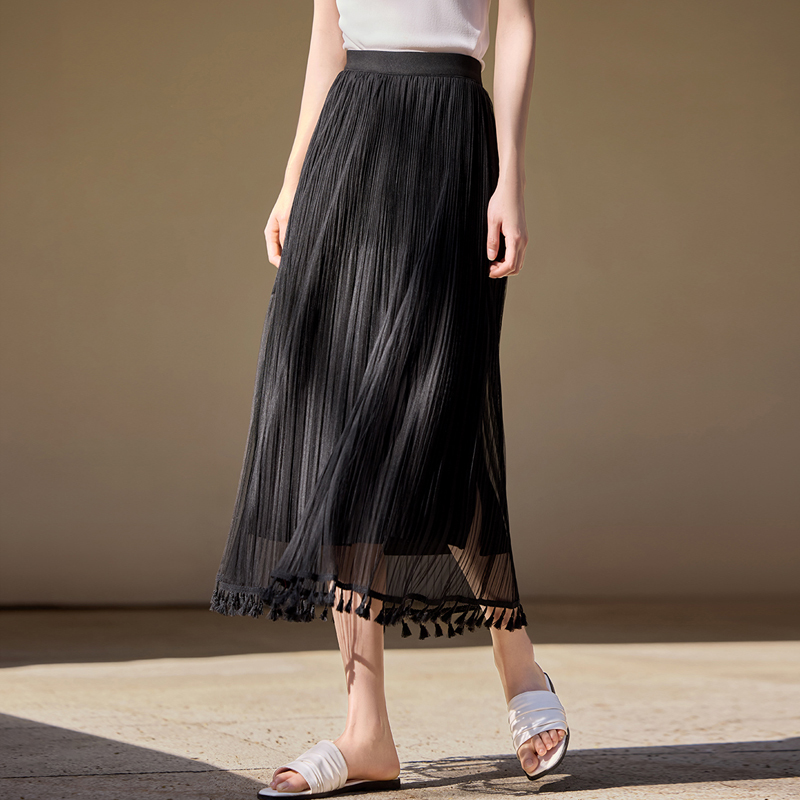 Elegant tassel and elegant pleated skirt black A-line skirt