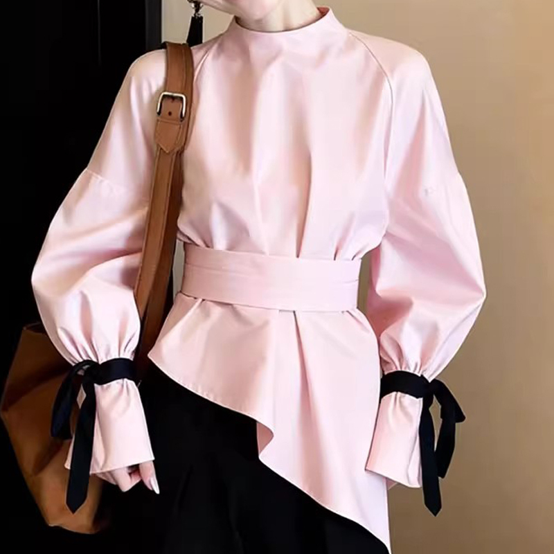 Pink high-quality women's shirt with waist and asymmetrical pullover sleeves