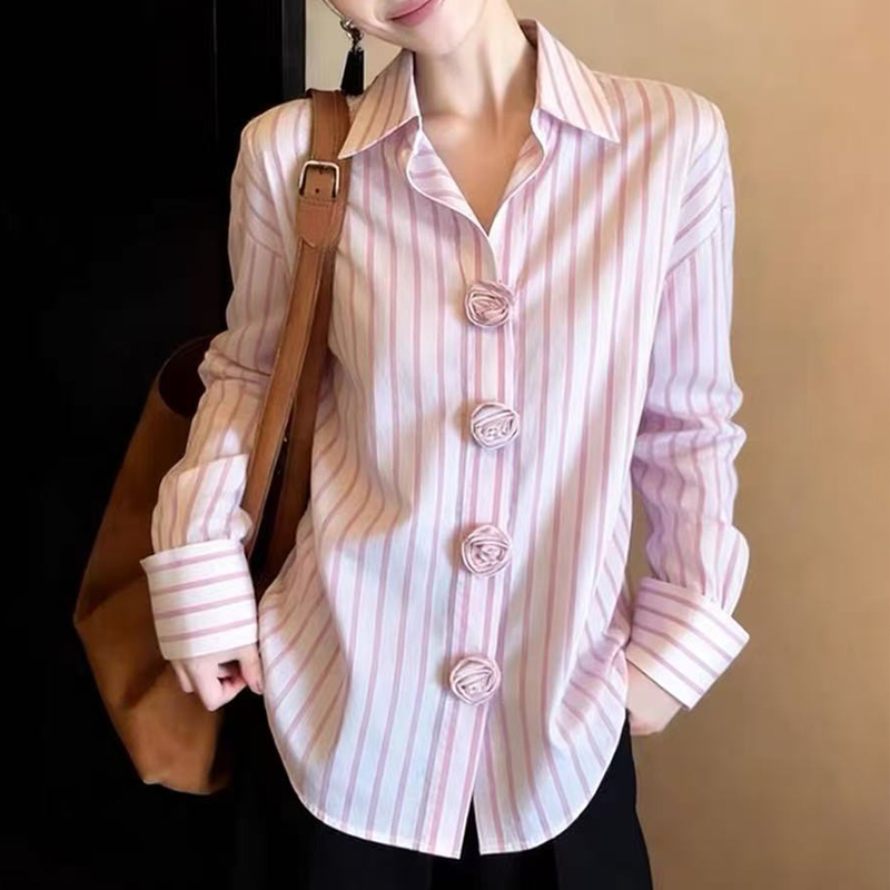 Pink vertical strips and flowers decoration New style women's sleeve shirt