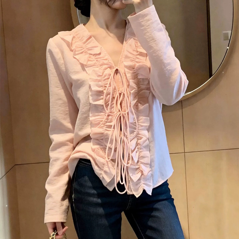Age-reducing ruffled pink lace V-neck new sleeve blouse