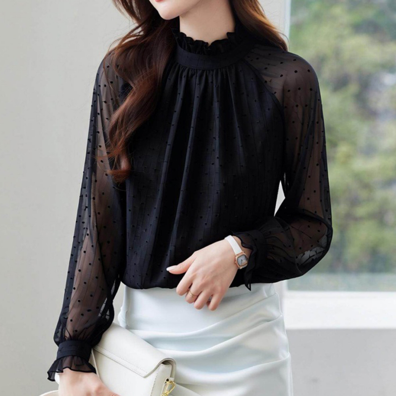 Black polka dot age-reducing fungus edge small standing collar pullover sleeves blouse