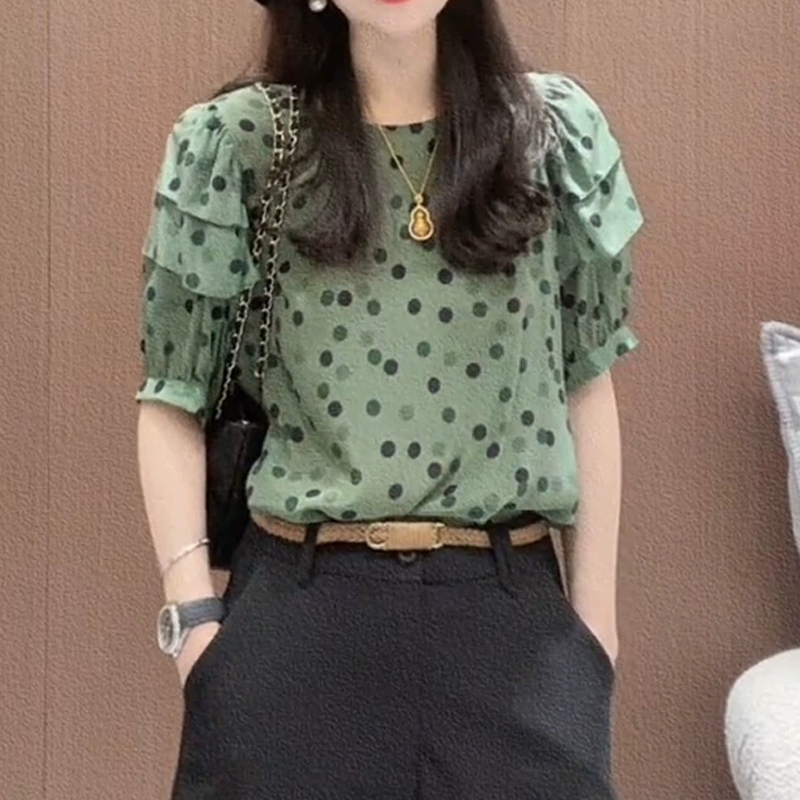 Design green polka dot lotus leaf sleeves summer short-sleeved blouse