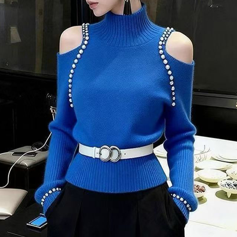 Design off-the-shoulder beaded slimming autumn and winter pullover sleeve sweater