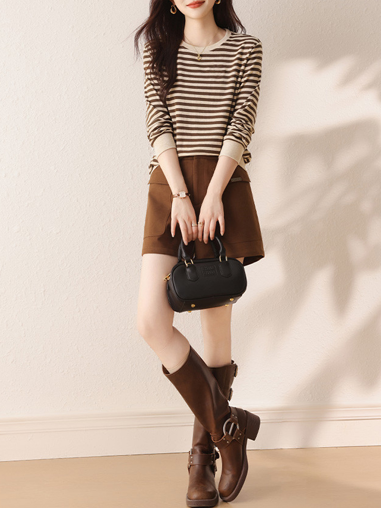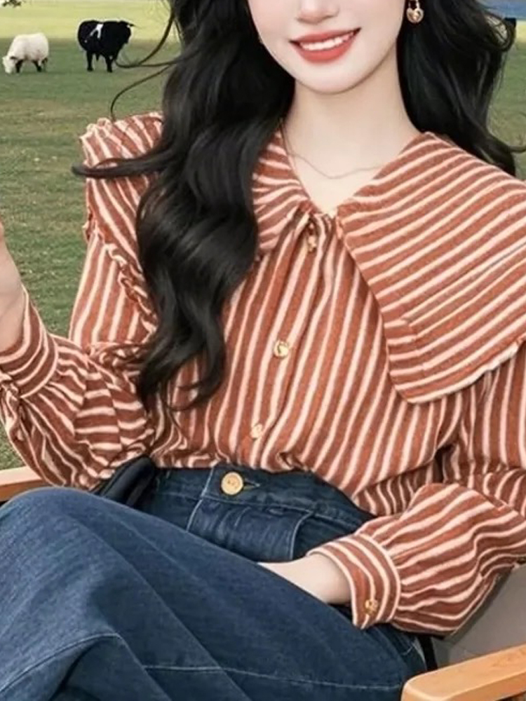 Fake two-piece contrasting color stitching casual coffee striped sleeve blouse