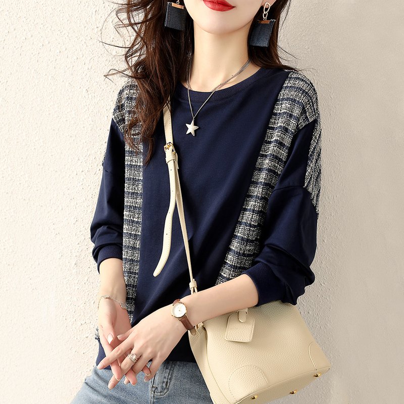 Plaid stitched navy blue embroidered long-sleeved sweater