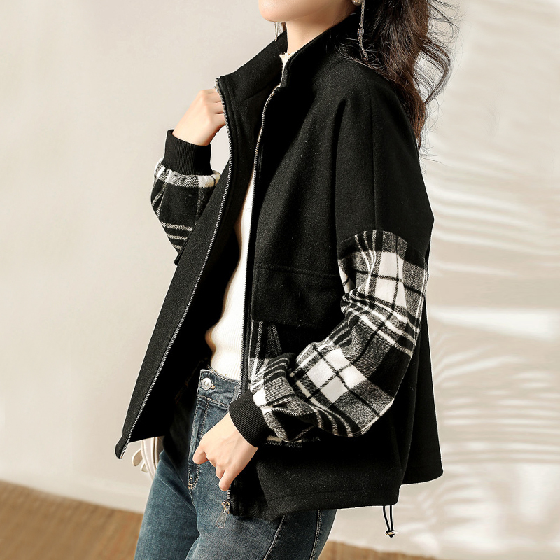 Stitched plaid black baseball uniform women's autumn and winter coat