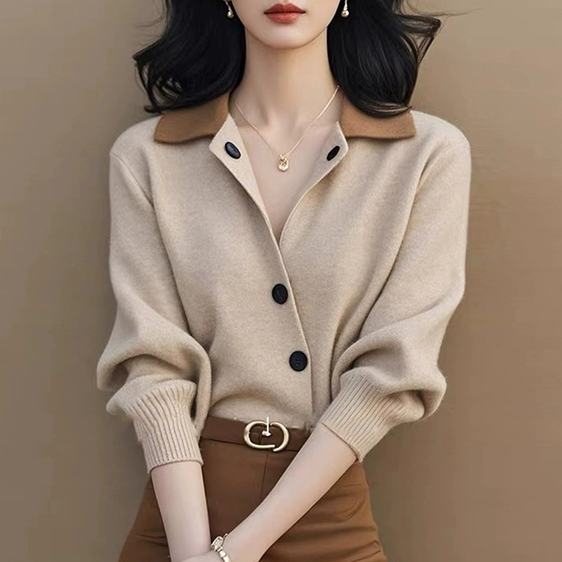 Contrasting lapels and oblique placket autumn and winter women's sweater top