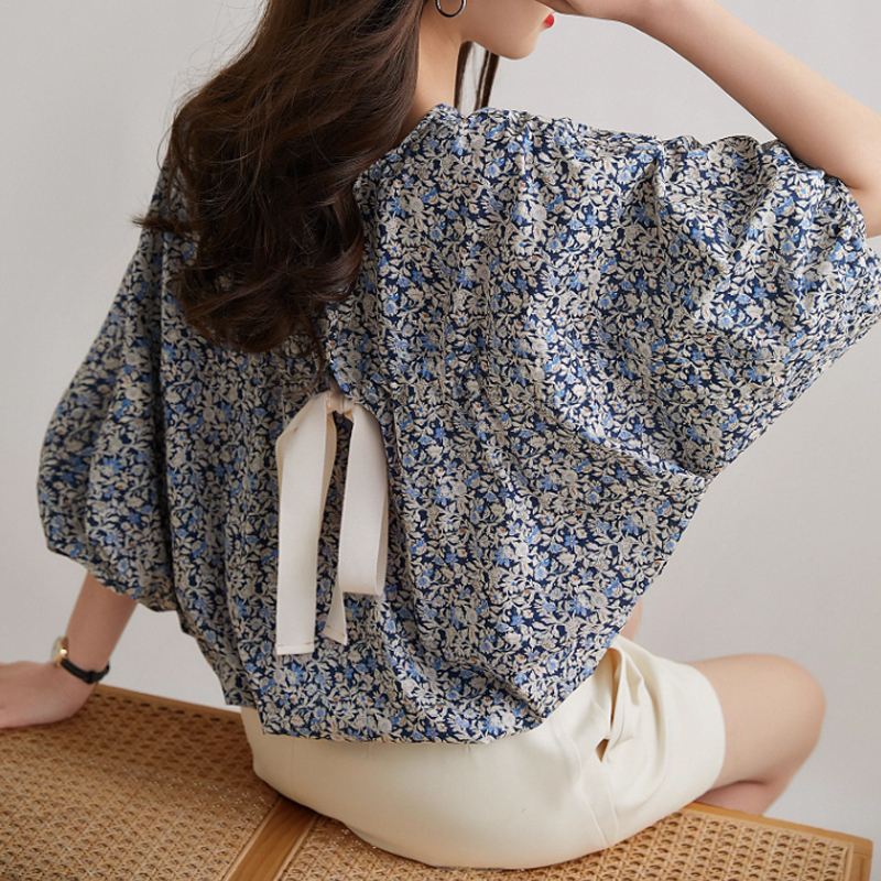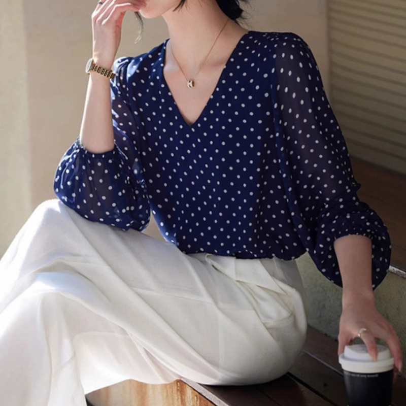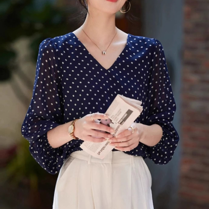 Blue polk-dotted V-neck quarter sleeves summer loose blouse