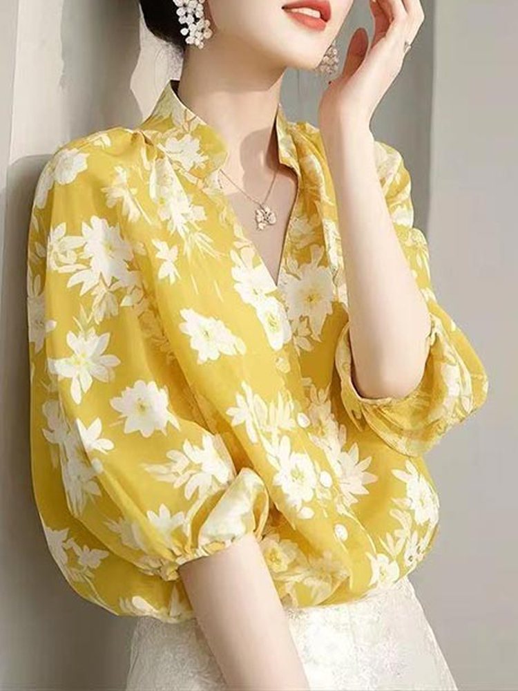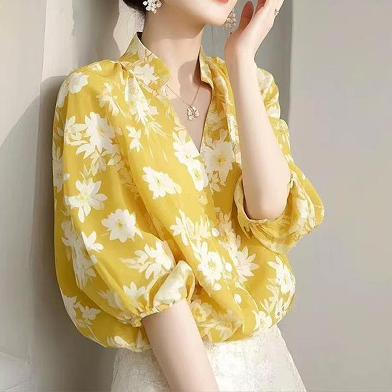 Beautiful French color yellow loose eight-quarter sleeve shirt