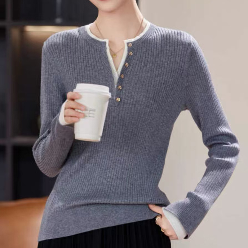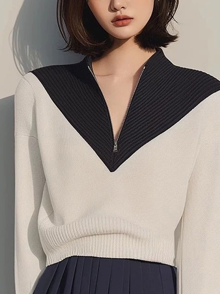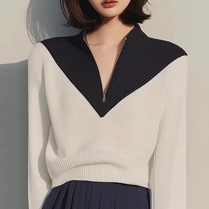 French contrast color stitching small V-neck pullover slim sleeve sweater