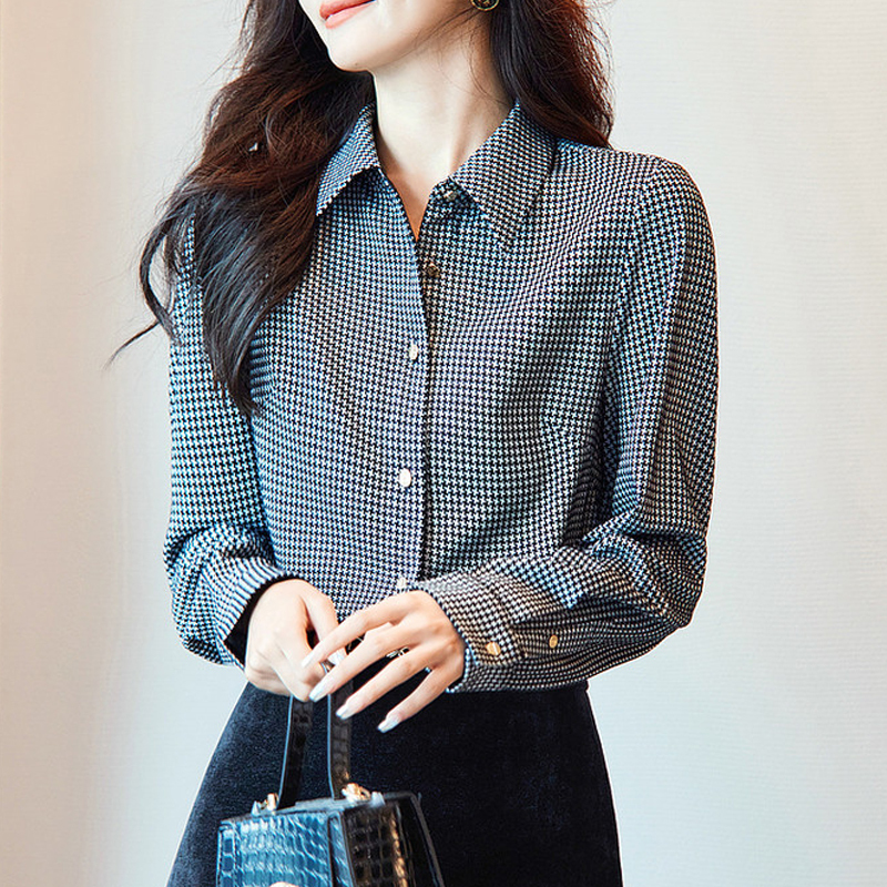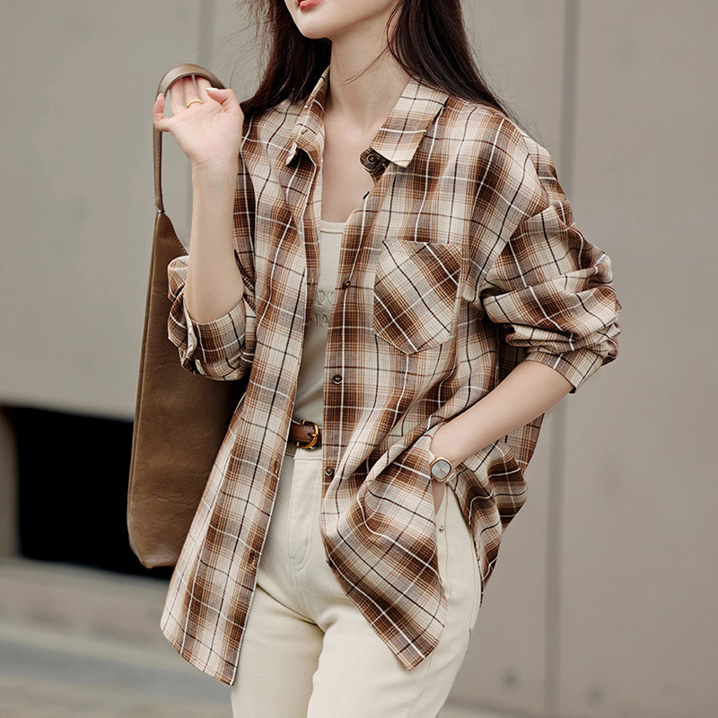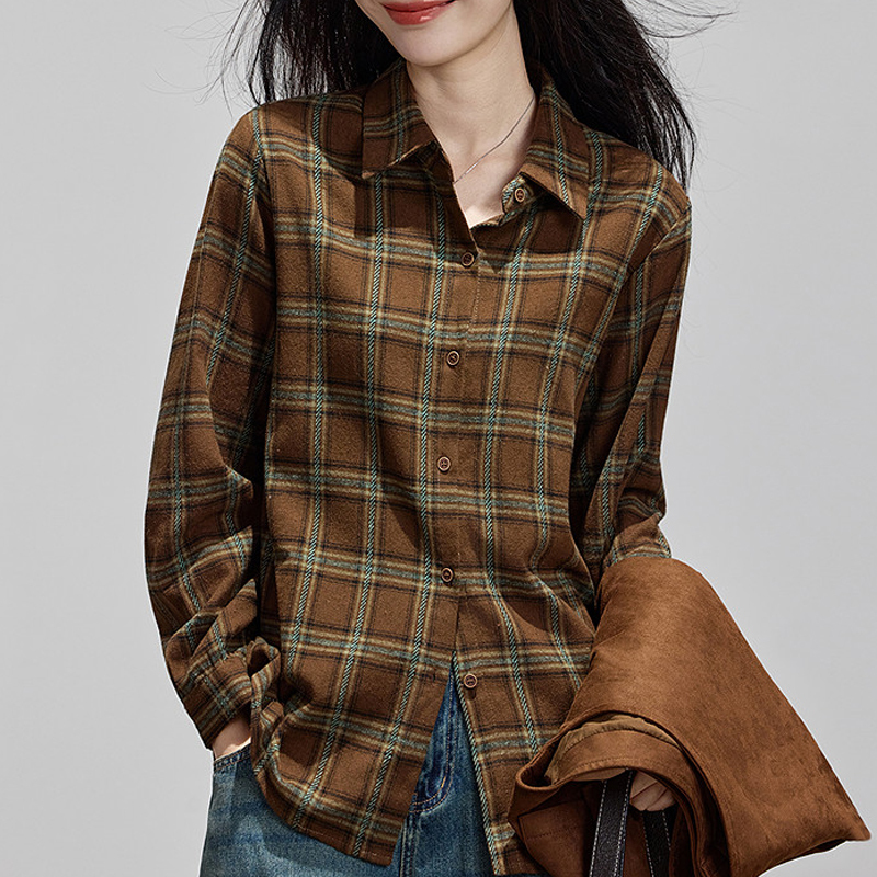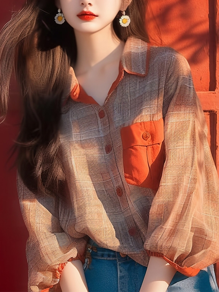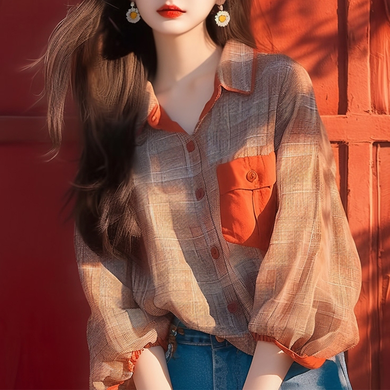Fake two-piece drawstring plaid coffee color new sleeve blouse