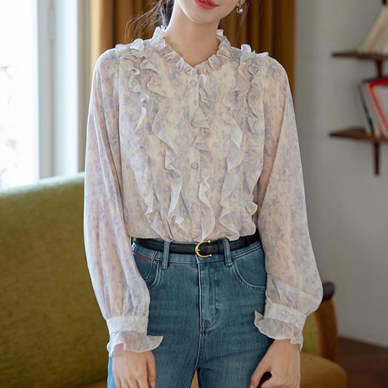 Age-reducing blouse with fungus rim and blue and purple sleeves
