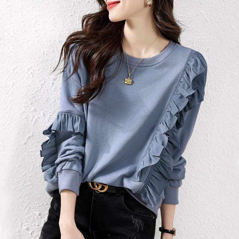 Asymmetrical lotus leaf edge stitched blue hoodie