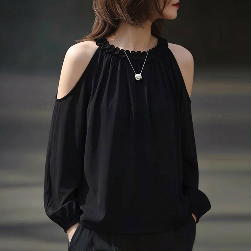 Black off-the-shoulder loose pullover with fungus edge, new style sleeve blouse