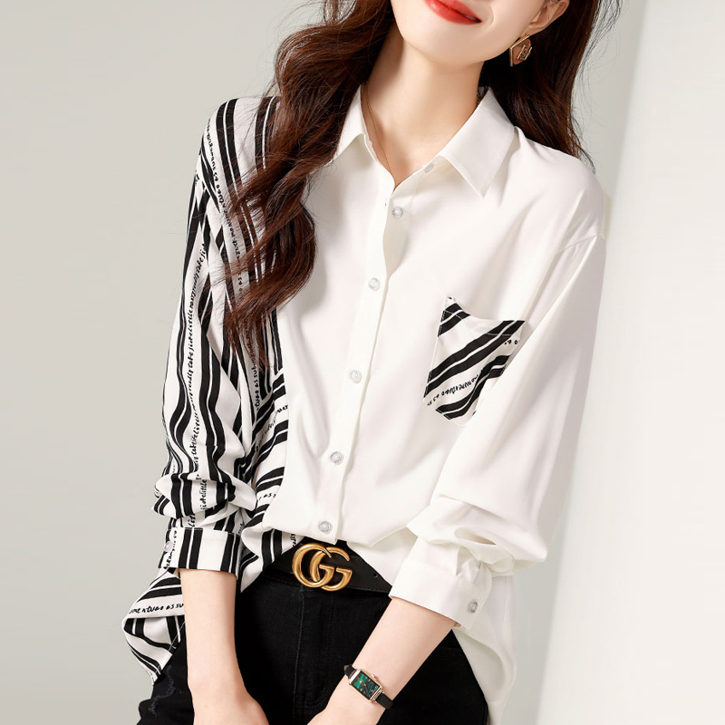 Color stripes stitching loose commuter long-sleeved blouses