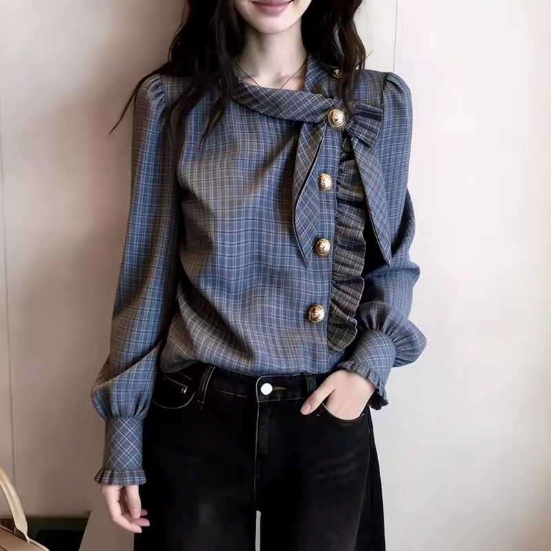 Design Asymmetrical ruffled casual plaid pullover sleeves blouse