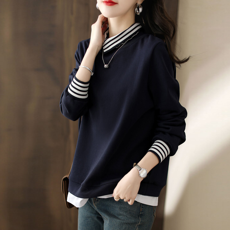 Design sense oblique collar collision color splicing navy blue sweater