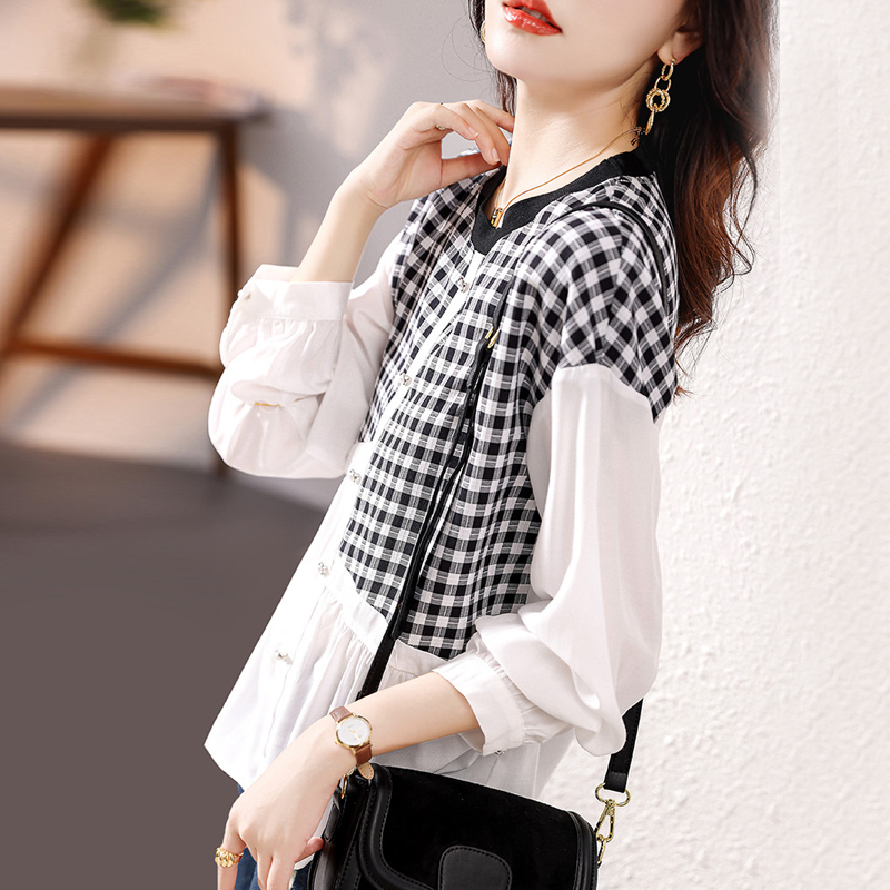 Design sense of color splicing black-and-white plaid long-sleeved blouse