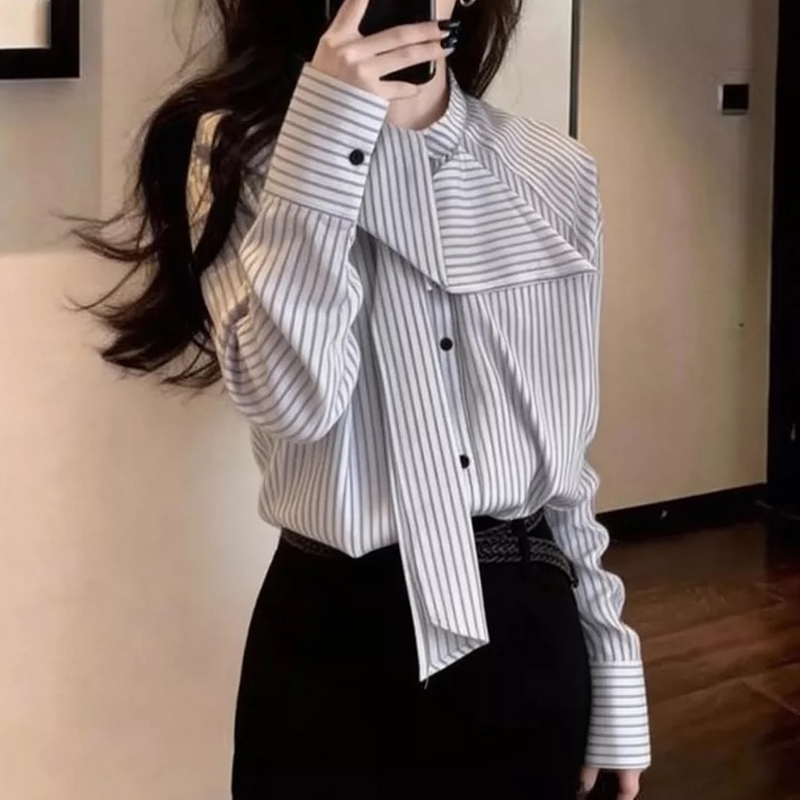 Design, spliced bow, silk, vertical stripe, loose sleeve shirt