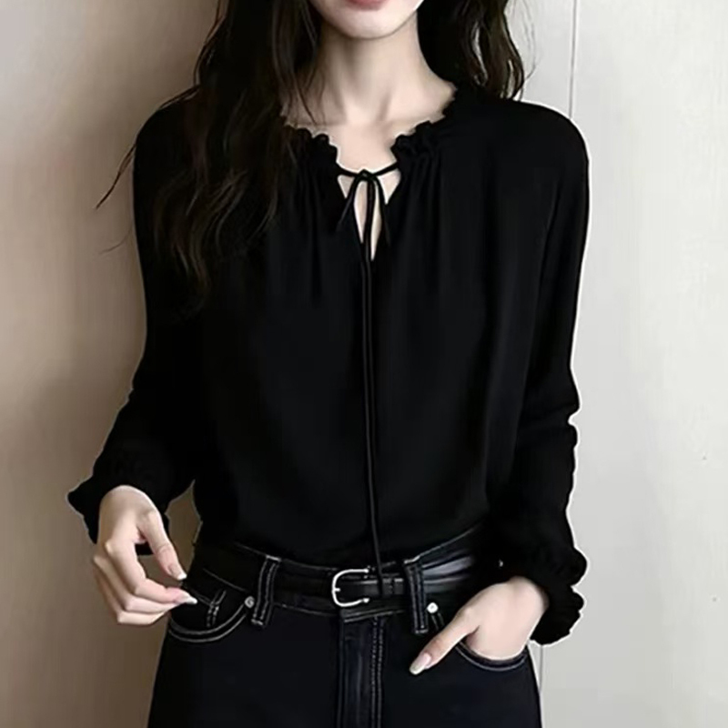 French light and mature design, small V-neck black sleeve shirt with fungus edge