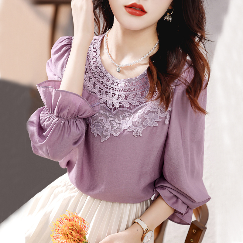 Hollowed-out lace stitched purple long-sleeved blouse
