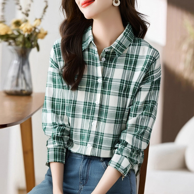 Hong Kong-style lapel commuting plaid new sleeve blouse