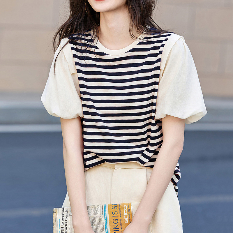 Loose lantern sleeves, short sleeves, striped new women's t-shirt and top