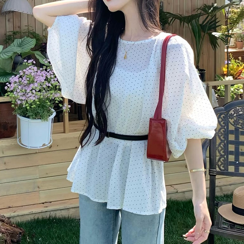Loose lazy wind lantern sleeves white polka dot pullover shirt