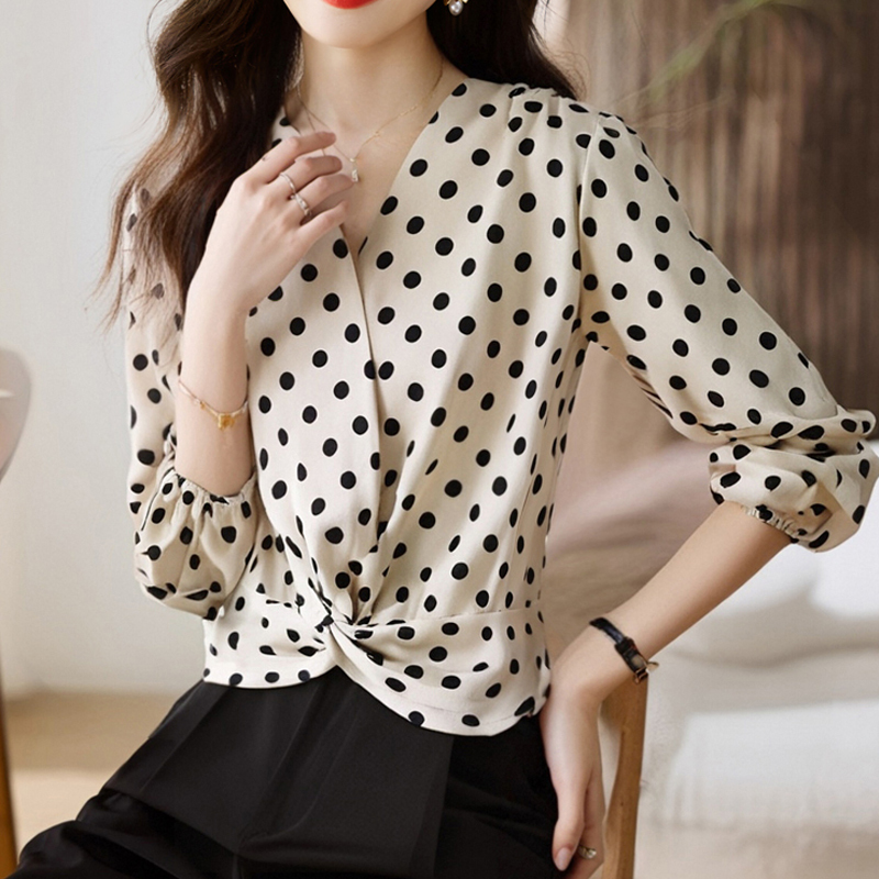 New V-neck kink design, pole-sensitive sleeve-sleeves blouse