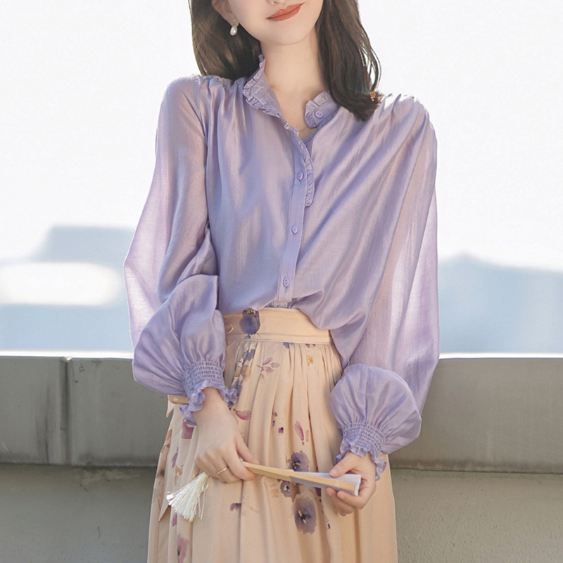 Purple long-sleeved lady's shirt with collar with ruffles