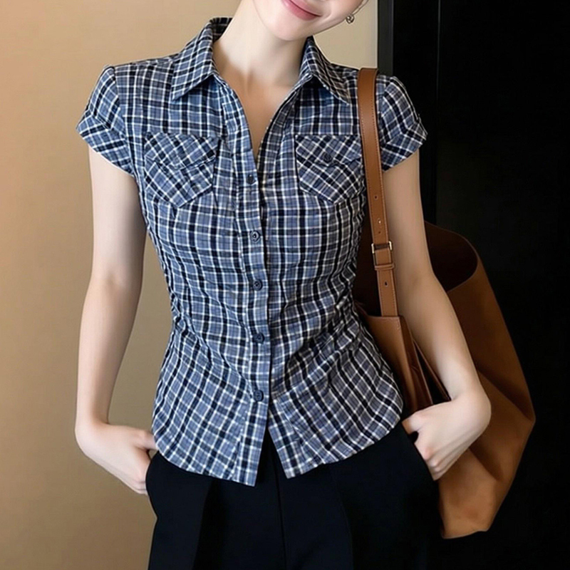 Retro slimming plaid waist waist new short-sleeved women's shirt
