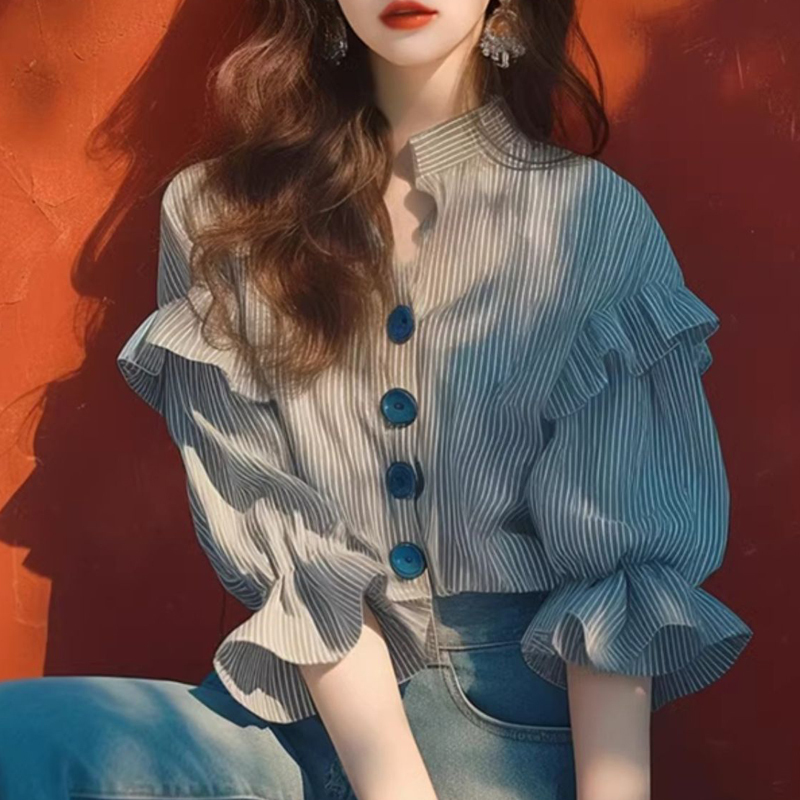Ruffled stitching stripe big button blouse