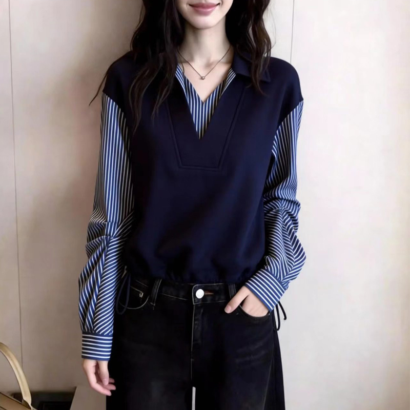 Stitched stripe contrast fake two-piece navy blue sleeve blouse