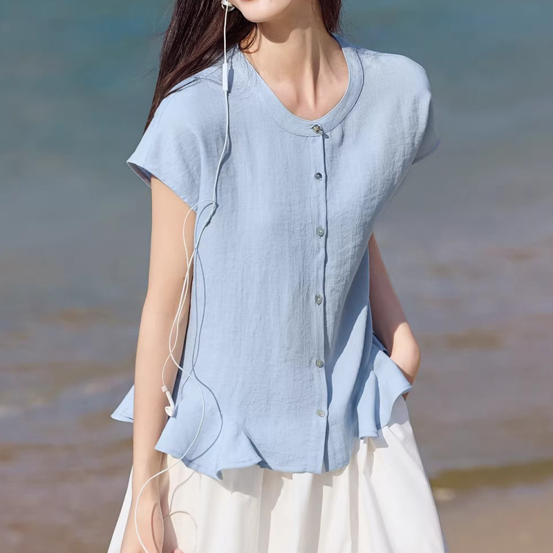 Summer blue ruffled hem shirt is elegant and relaxed to show a thin shirt